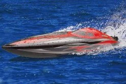 More than 2’ long, the Bancroft Bullet V3 delivers the size, speed, handling, and stability that only an offshore Deep-V hull design can provide in a powerful, brushless, Ready To Run (RTR) package. Open the box, charge the included battery packs (yes, there are two battery packs included!!) with the provided charger, install your own AA batteries into the included 2.4Ghz radio transmitter, and toss the boat into the water! All of the electronics are pre-installed, and the boat’s running gear is setup for amazing speed and razor-sharp maneuverability right out of the box without any additional adjustment. The Bancroft Bullet V3 sports an attractive, hi-visibility trim scheme that accentuates its speed and performance potential.