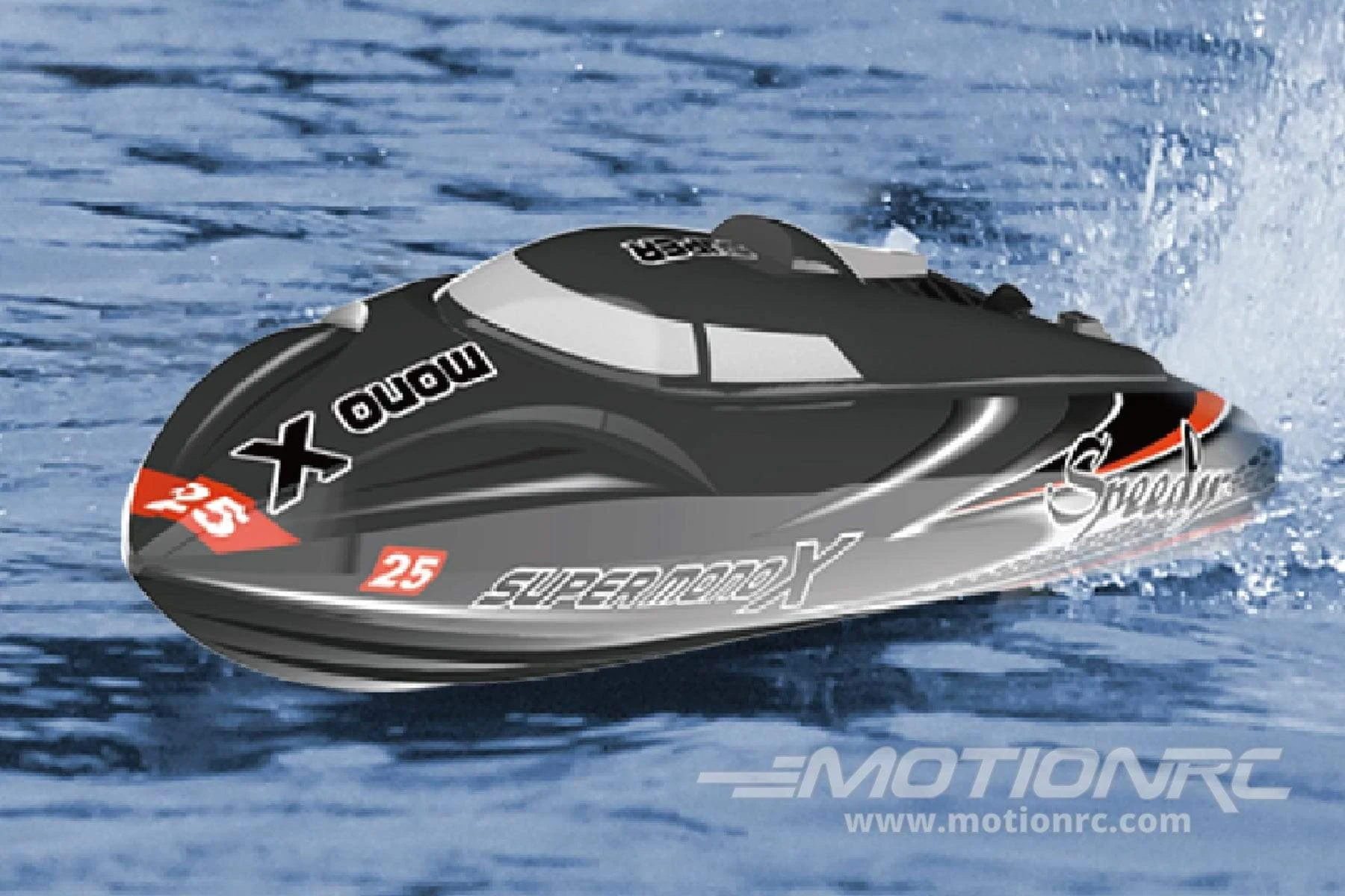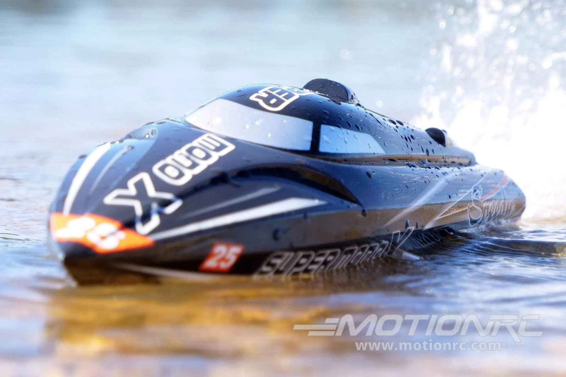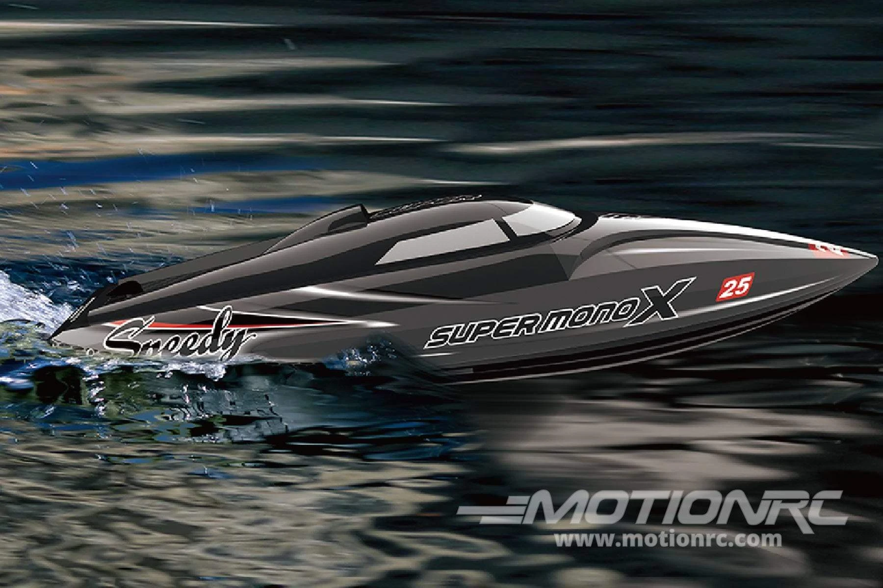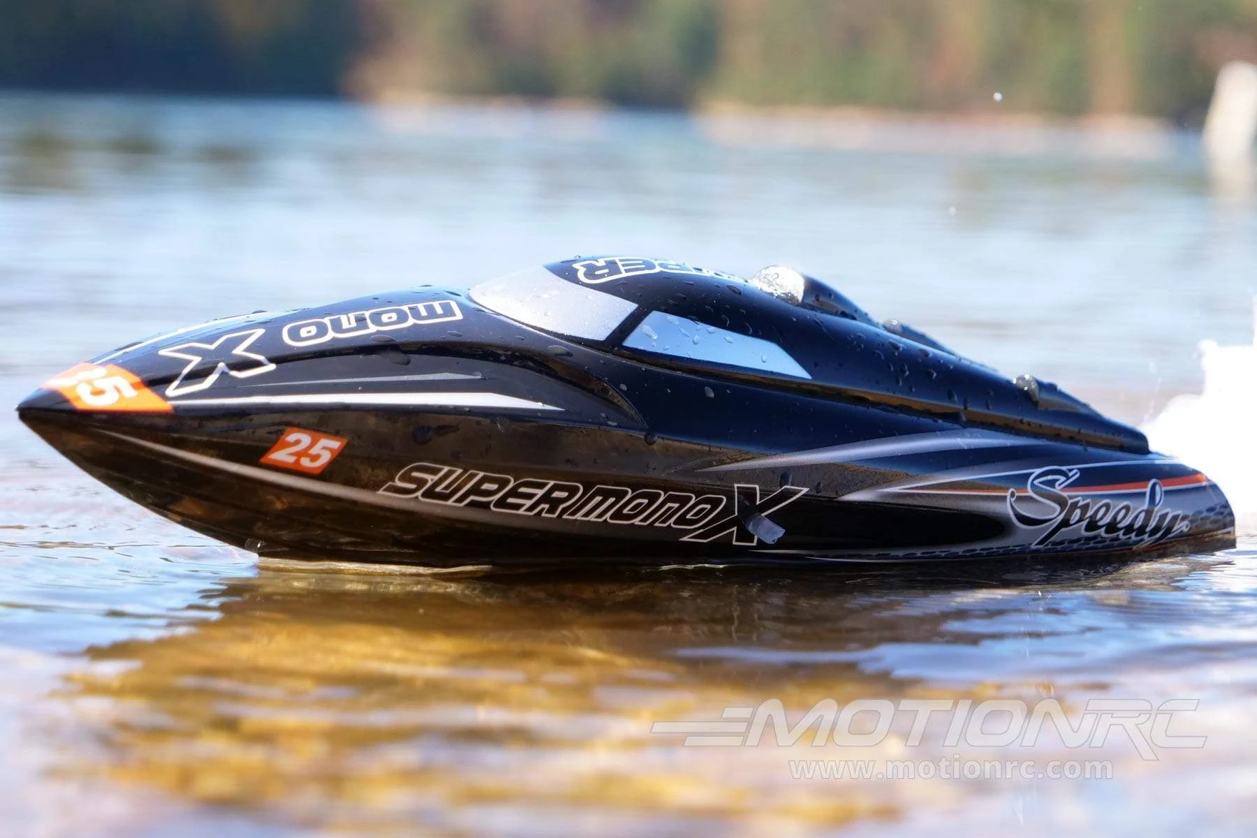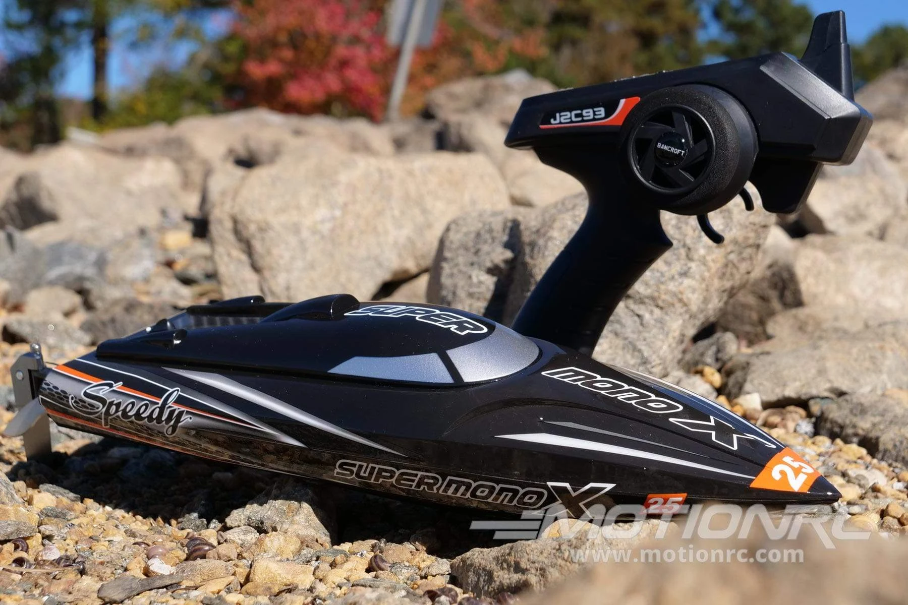 Display this racing boat on your mantle or enjoy it on the water with this functional RTR (Ready to Run) model. Delivered Ready to Run (RTR), the Super Mono X can be operating within minutes of opening the box, using the included 2.4Ghz radio transmitter, 3S battery, and battery charger.