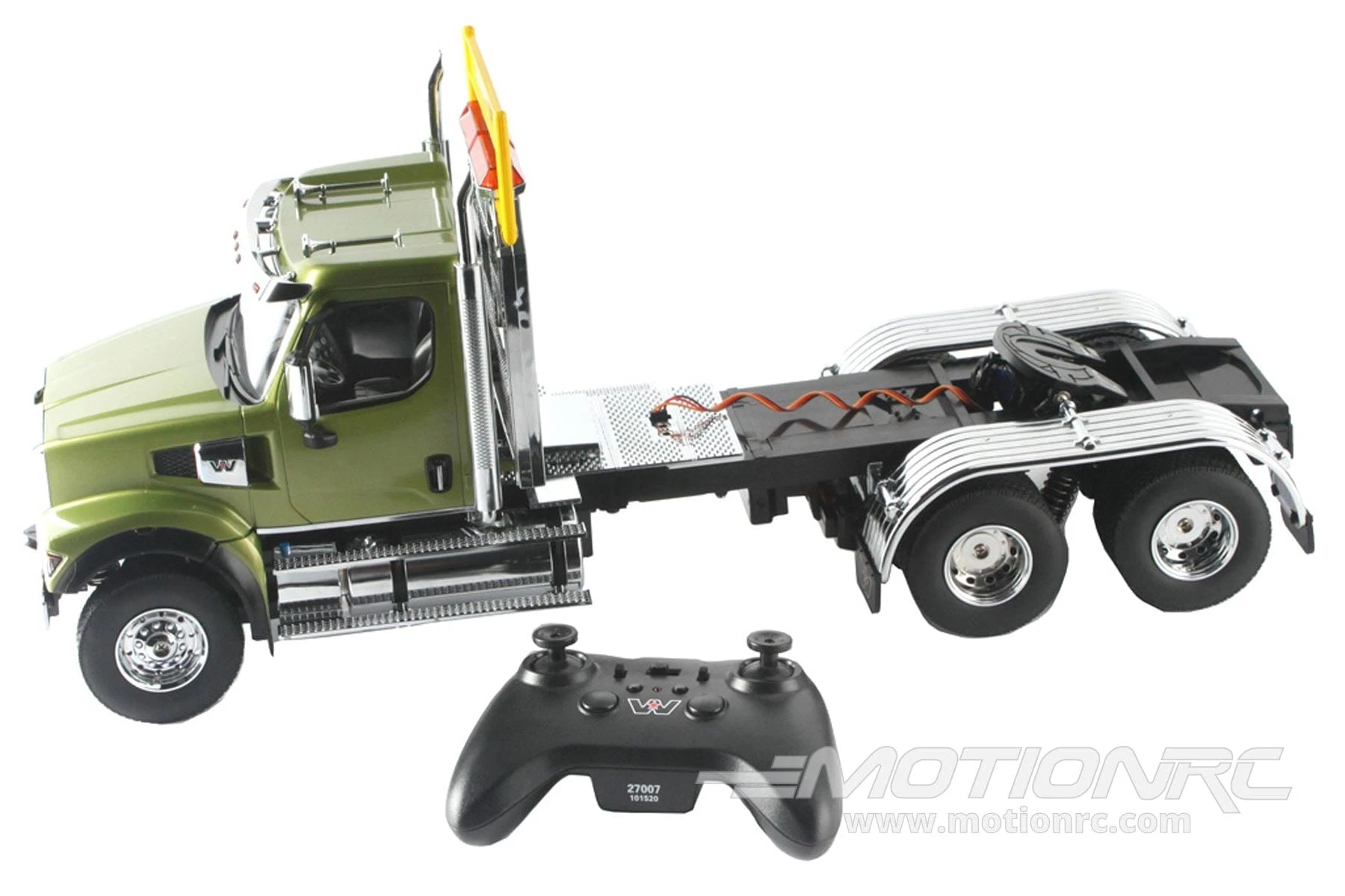 The Western Star 49X is widely recognized as one of the most powerful and reliable tractors for use in mining, construction, and transportation. The Diecast Masters officially licensed 1/16 scale RC replica features an interference-free 2.4GHz radio system with digital proportional throttle operation in forward and reverse, steering, and operational lock/unlock of the fifth-wheel kingpin via the transmitter. Functional headlights, taillights, cab markers, turn signals, backup lamps, and realistic sound system combine to result in an amazingly realistic replica suitable for display or operation. Use this tractor with Diecast Masters 1/16 scale XL 120 Trailer (DCM27008) for a truly impressive 1/16 scale tractor/trailer rig!