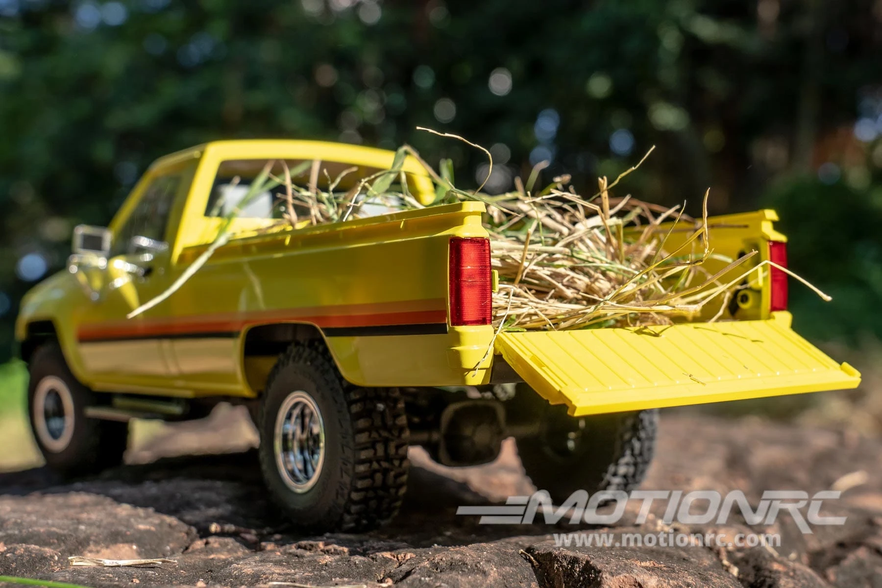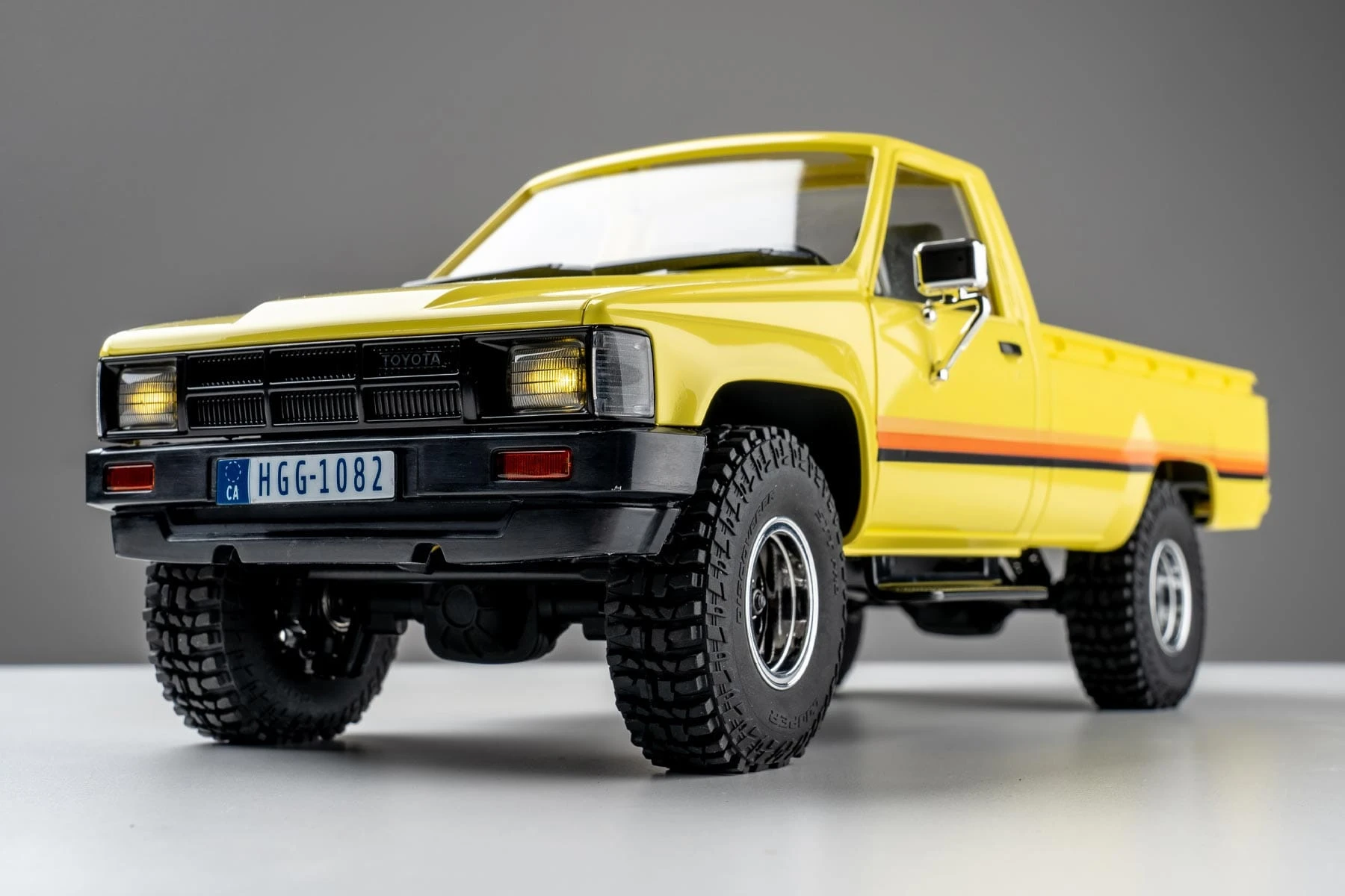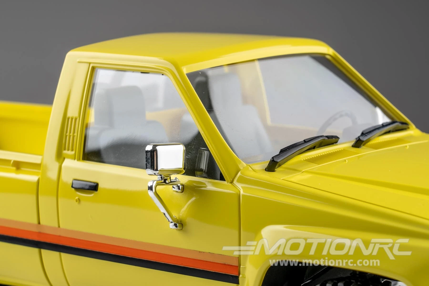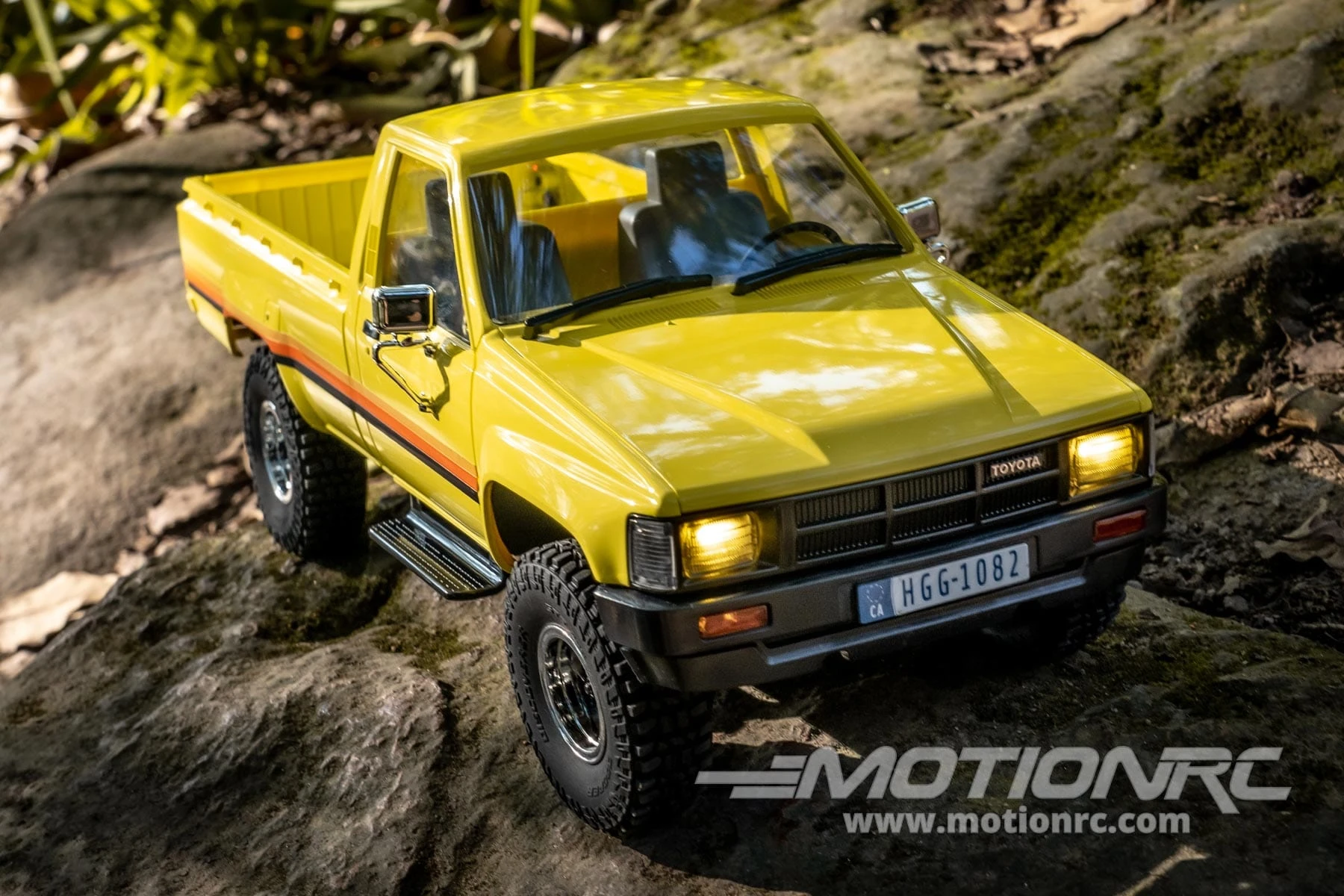 The FMS Toyota Hilux Pickup 1/18 Scale 4WD Crawler RTR from Motion RC is an ideal choice for scale adventure, offering working and static details that create an exceptional modeling experience! This officially-licensed Toyota icon includes features such as realistic LED light set with headlights, turn signals, and brake lights. The injection-molded, rigid plastic body contains scale details such as a model year-accurate (1983) front grille, bumpers, and plated wheels and side mirrors. The opening tailgate provides access to a generous bed that can be filled with your choice of payload or other scale accessories. Even the famous yellow color scheme with tri-color stripe is accurately reproduced and then painted with a protective clear coat to maintain a classic factory appearance. Full interior details include a realistic front seats and dashboard that complement this truly exceptional scale model.