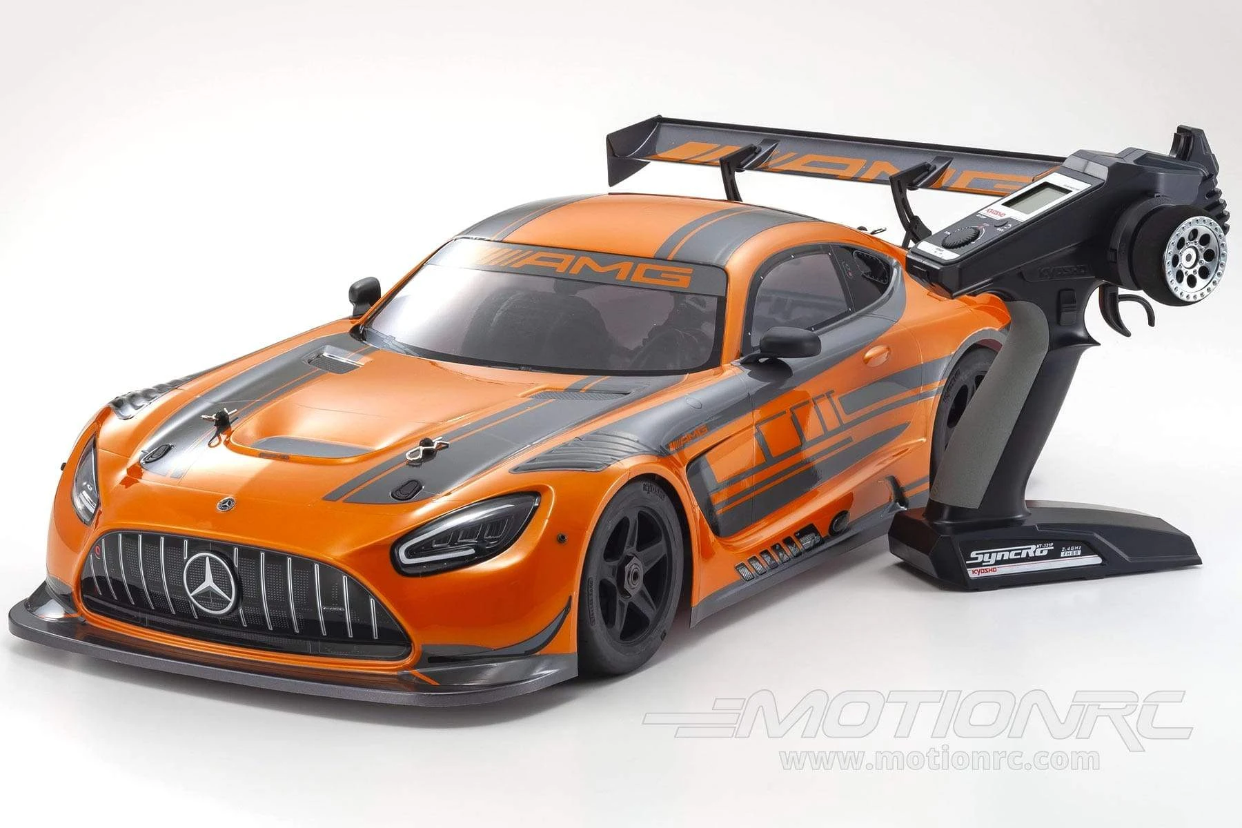 The included 2.4GHz Syncro KT-331P transmitter automatically manages frequency bands and features high visibility LCD screen with the functions expected of a mid-range transmitter such as dual-rate and ABS plus safety features such as failsafe function. The Syncro KT-331P works in perfect combination with the high-torque, metal-geared KS-5031-09MW servo to deliver finger tip control of the big size GT machine. With the Readyset, you can experience the dynamic action of GT racing without delay while the quiet performance of electric motor power opens up this experience to any time and place and it is backed by Motion RC’s world-renowned customer service and technical support. Drive on!