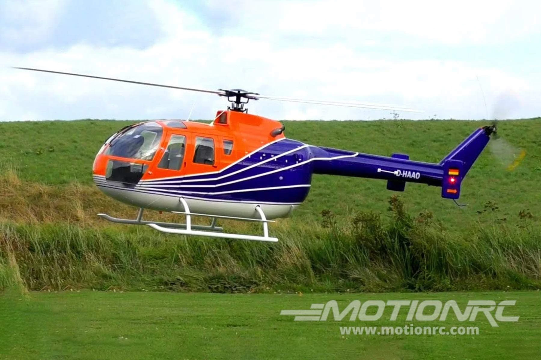 This is the Roban BO-105 Orange and Blue 800 size ARF, a premium scale kit that offers unparalleled detail. From tip-to-tail the BO-105 body kit displays an accuracy of detail to the real aircraft not normally seen in the RC helicopter hobby.