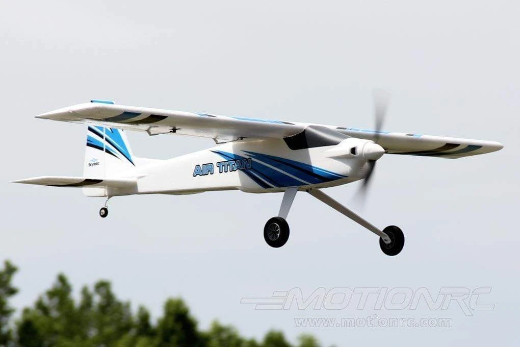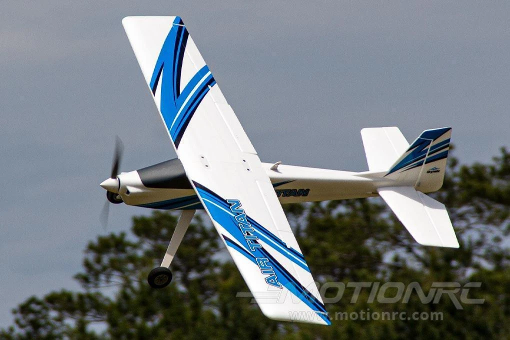 The Skynetic Air Titan is one of our most versatile and fun to fly RC airplanes. Its large wingspan, high-wing configuration, and durable metal landing gear make it an ideal trainer aircraft for beginner pilots. But this is not just a great trainer, the Air Titan’s powerful motor and solid construction mean it can handle advanced aerobatics and more aggressive flying techniques. You can even use the Air Titan to tow your favorite glider to high altitudes using the included servo-controlled tow hook.